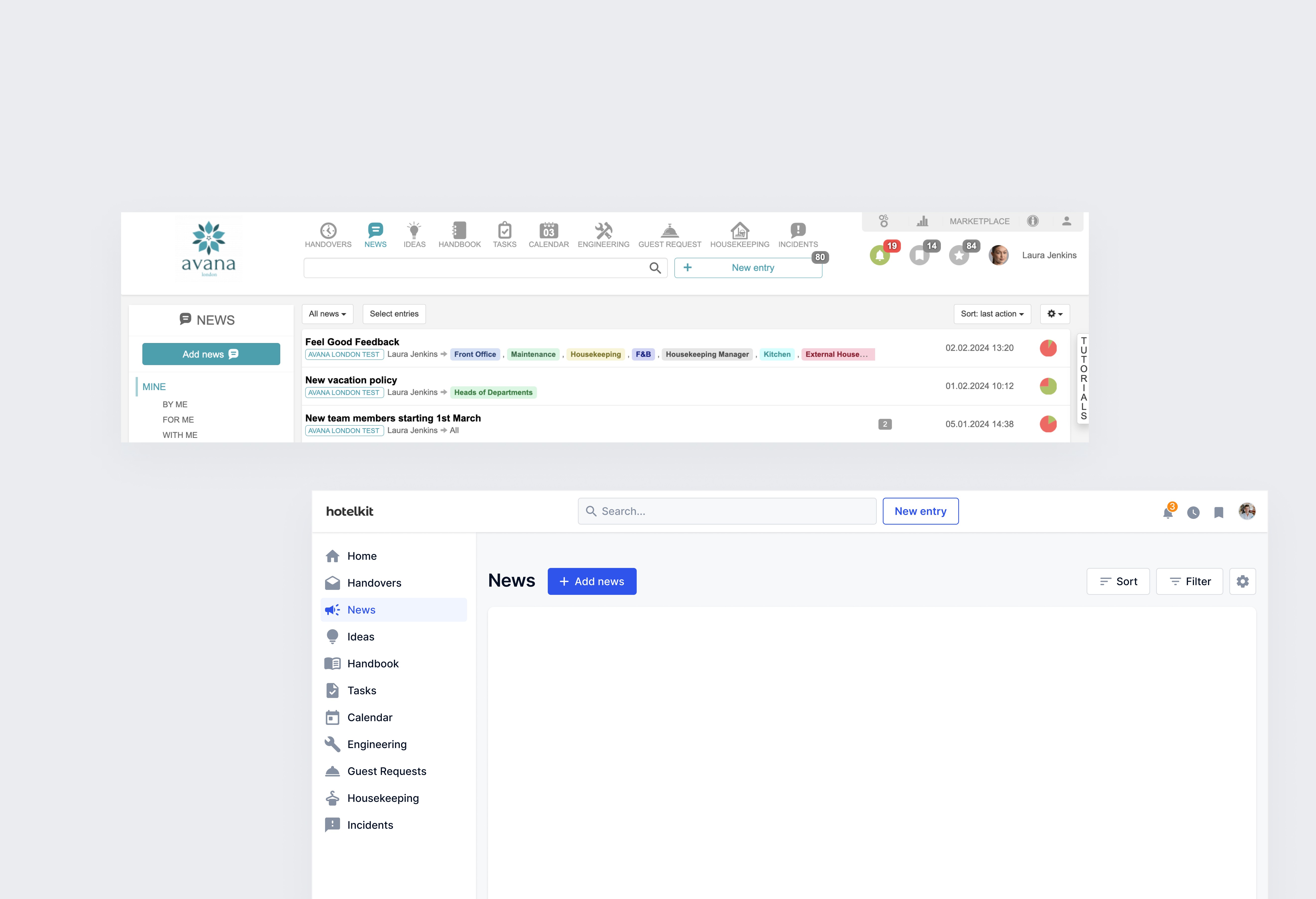 After more than 10 years of growing the hotelkit platform with new tools and features, navigating the interface had become a cumbersome task. Taking inspiration from other established SaaS platforms, the idea of changing hotelkit's main navigation had been long under way. Following a comparison of modern navigation patterns, our design team had a few competing ideas we wanted to further investigate.